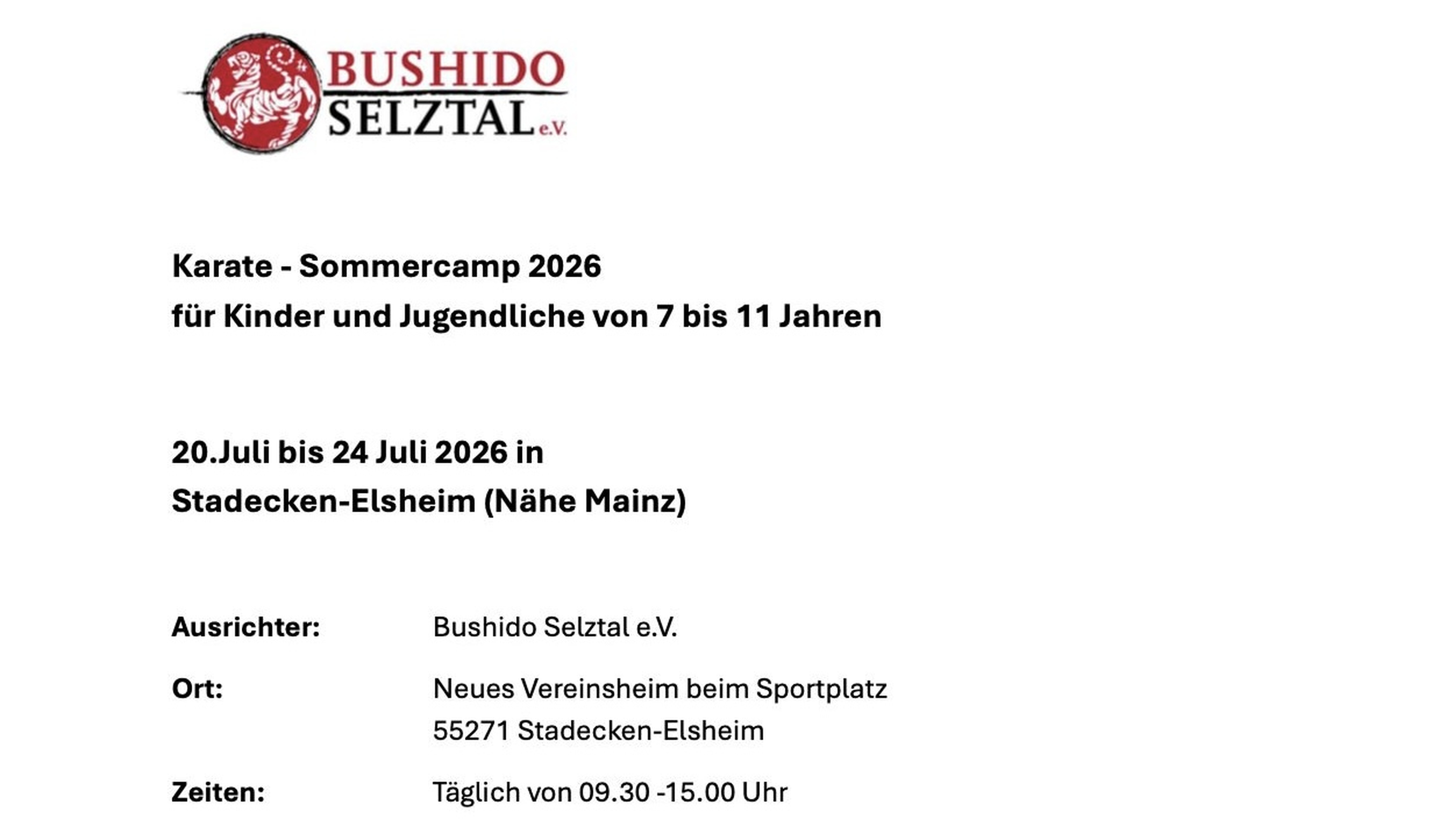 Liebe Kids und Jugendliche, liebe Eltern, auch in diesem Jahr bieten wir euch wieder unser Karate-Sommercamp an. 5 Tage Spiel, Spaß, Bewegung und natürlich Karate. Den Tagesablauf stimmen wir auf die Kinder ab. Verpflegung inklusive. Nähere Infos auf beiliegender Ausschreibung und Anmeldung. Viel Spaß!!!