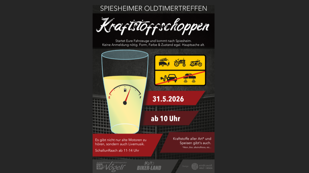 Kraftstoffschoppen Startet eure Fahrzeuge und kommt nach Spiesheim! Keine Anmelung nötig. Form, Farbe & Zustand egal. Hauptsache alt. Es gibt nicht nur alte Motoren zu hören, sondern auch Livemusik. Kraftstoffe aller Art* und Speisen gibt es auch. *Wein, Bier, alkoholfreies etc.