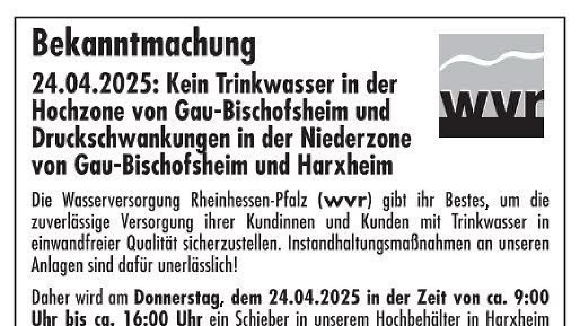 Eingeschränkte Wasserversorgung am 24.04.2025