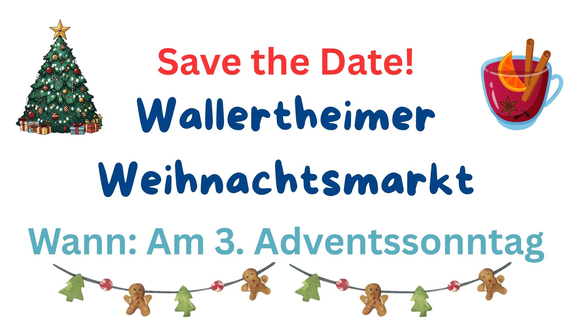 Save the Date- Am dritten Adventssonntag findet in Wallertheim ab 14:00 Uhr der beliebte Weihnachtsmarkt rund um den festlich geschmückten Weihnachtsbaum statt. In diesem Jahr wird der Weihnachtsmarkt wieder auf dem Kirchplatz und der angrenzenden Agnesienstraße stattfinden. Weitere Infos folgen demnächst.