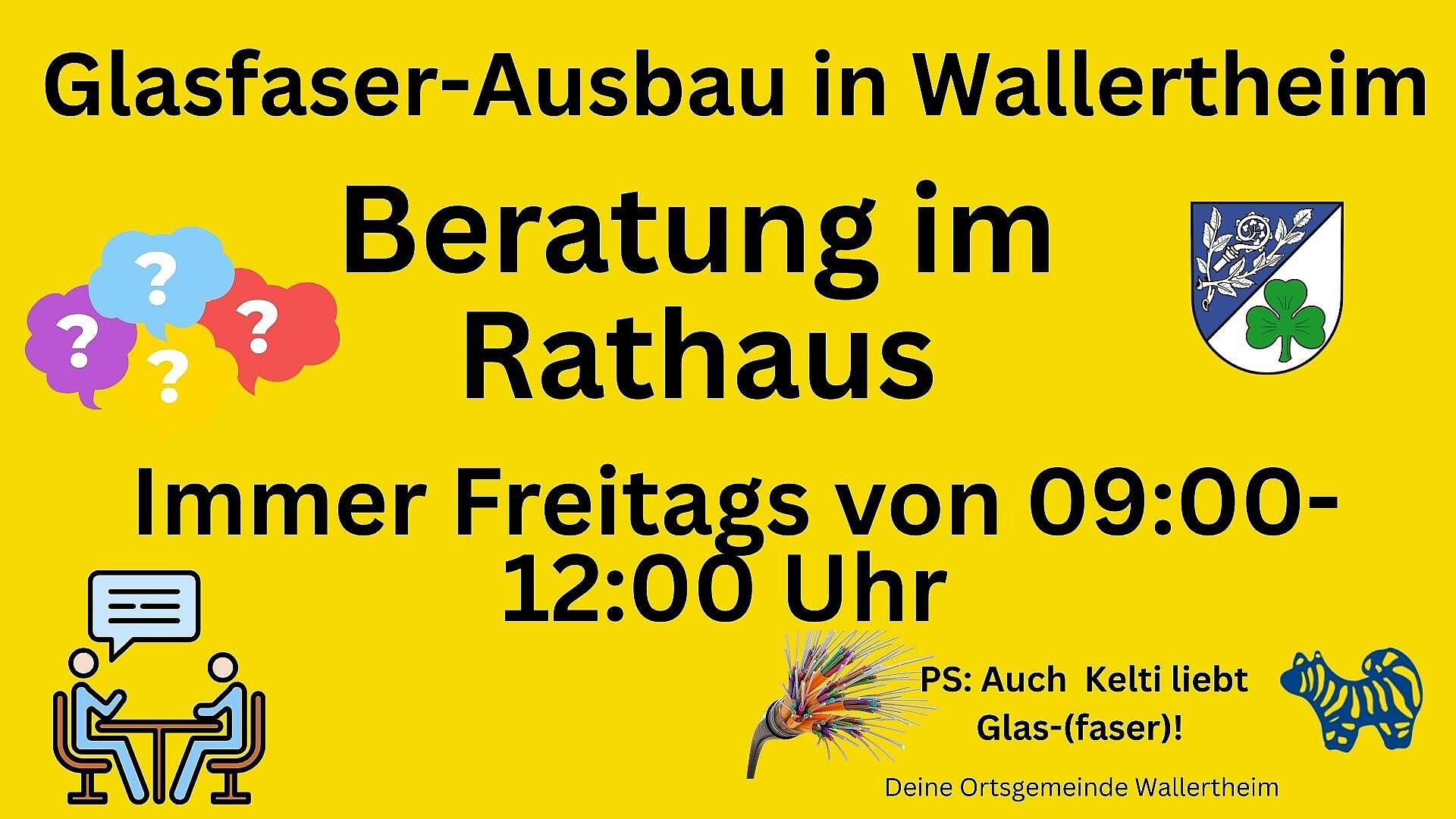 Persönliches Beratungsangebot zum Glasfaserausbau im Wallertheimer Rathaus Die Bauarbeiten zum flächendeckenden Glasfasernetz in Wallertheim haben im November begonnen. Für unser Dorf ist das ein wichtiges, aber auch besonders großes Infrastruktur-Bauprojekt. Wenn Sie konkrete Fragen zu Ihrem Hausanschluss oder Tarif haben, dann können Sie sehr gerne das persönliche Beratungsangebot der EWR Netz GmbH in unserem Wallertheimer Rathaus in der Neustraße 3 nutzen. Die Beratung findet immer am 1. Freitag im Monat von 09:00-12:00 Uhr statt. Nutzen Sie sehr gerne dieses Beratungsangebot und kommen spontan vorbei. Die nächsten Termine sind: 05.12.2025/09.01.2026/06.02.2026/06.03.2026.