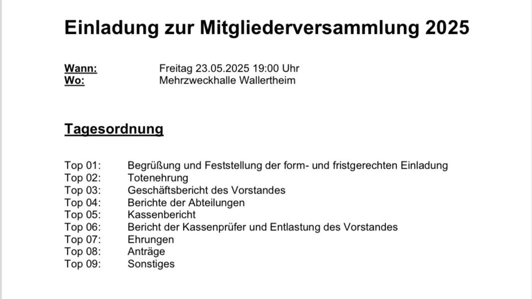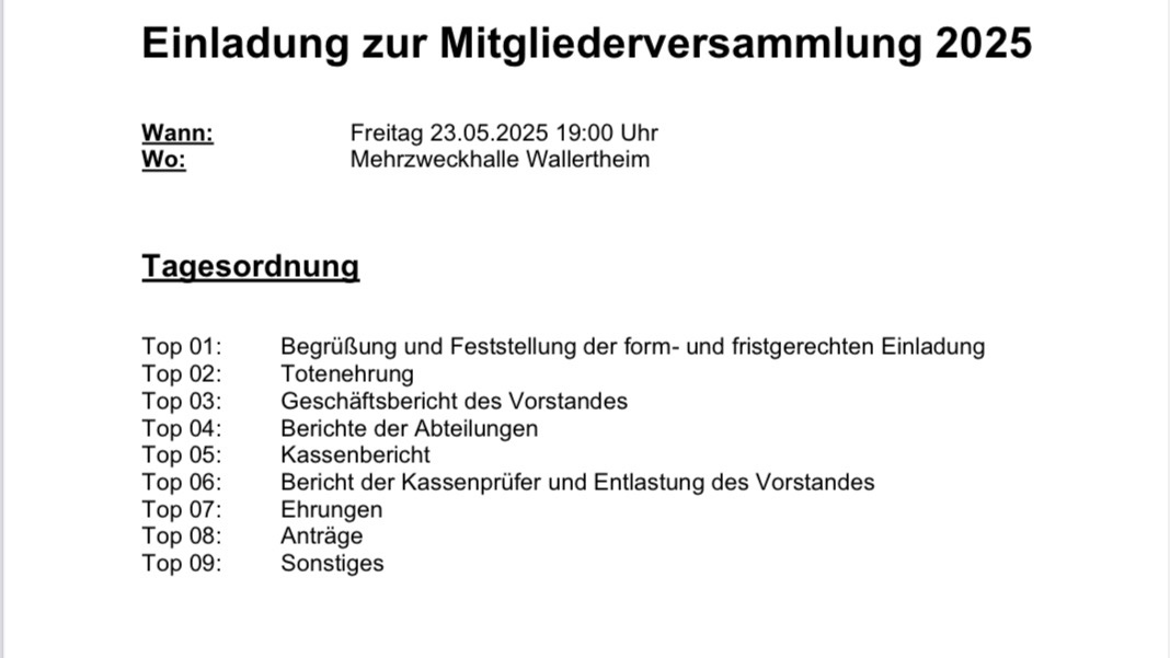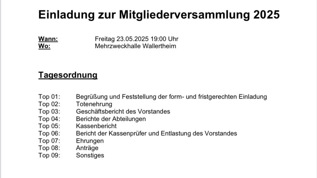 Mitgliederversammlung der TGW am 23. Mai 19Uhr