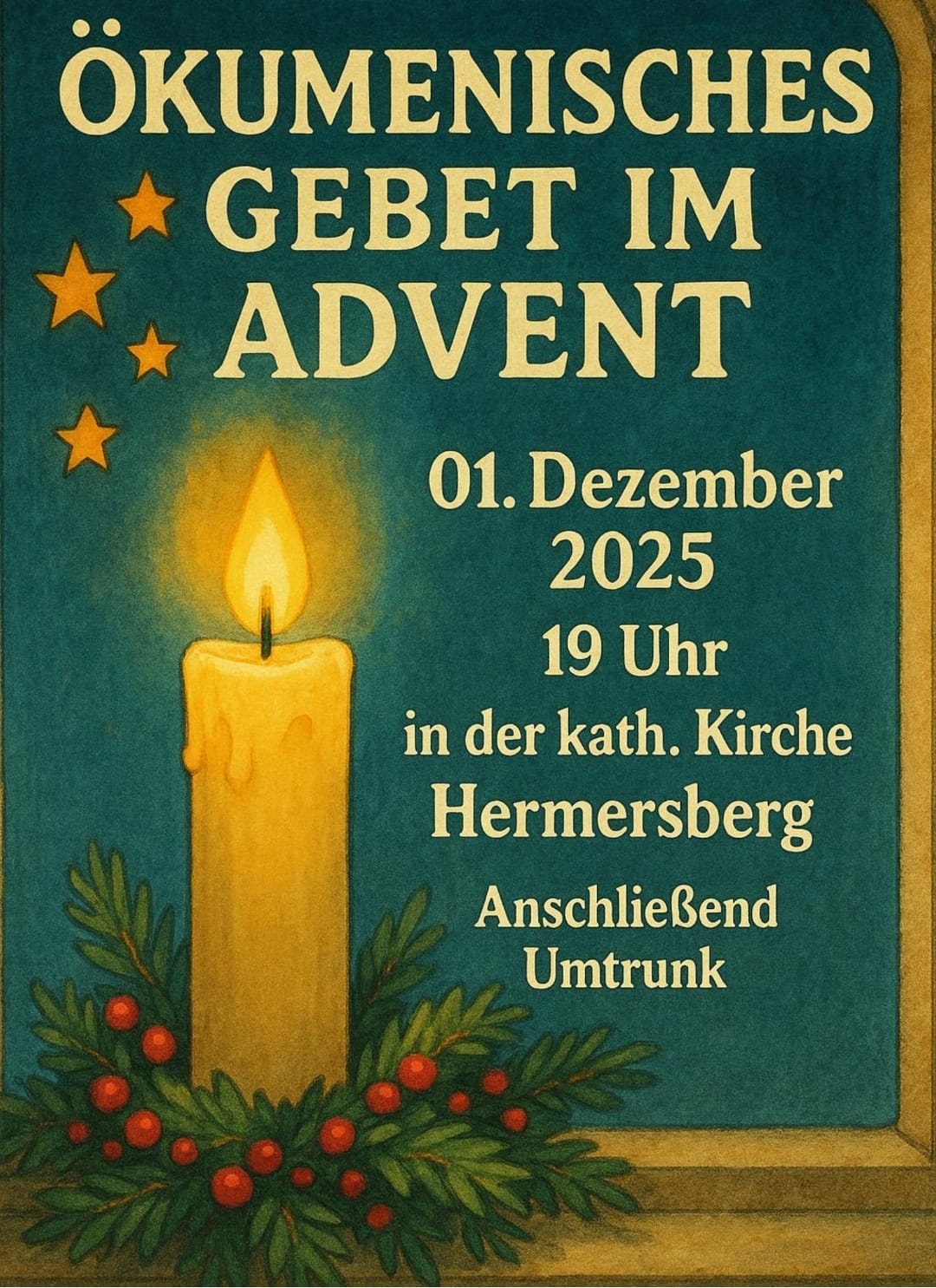 Am 01.12.2025 um 19 Uhr lädt der Ökumenekreis Hermersberg/Weselberg zum ökumenischen Gebet im Advent in der katholischen Kirche Hermersberg ein.