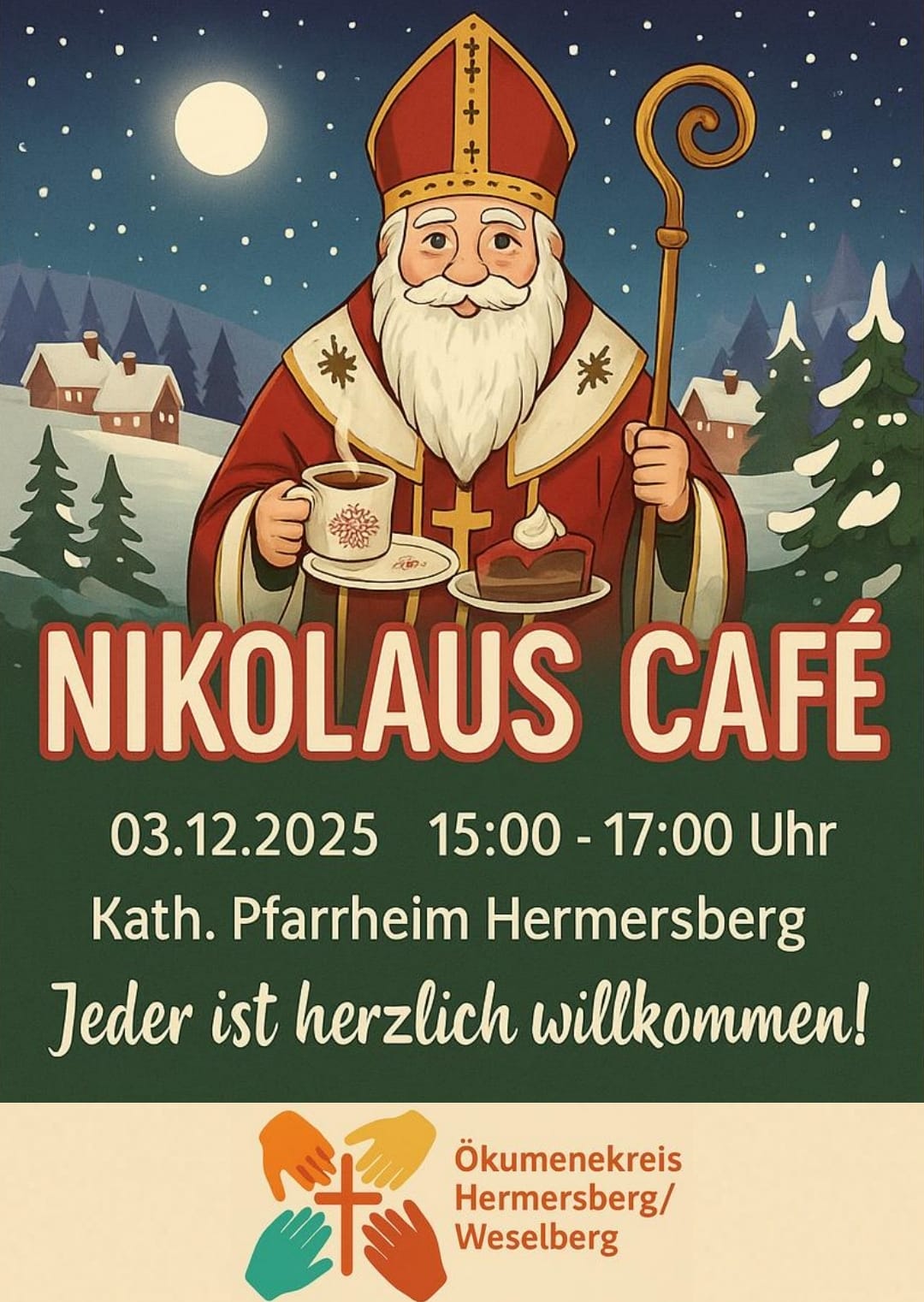 Der Ökumenekreis Hermersberg/Weselberg lädt herzlich ein zum Nikolaus Café am Mittwoch, 03.12.25 von 15:00–17:00 Uhr im kath. Pfarrheim.