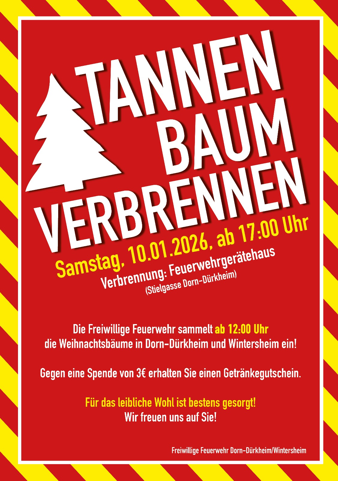 Die Freiwillige Feuerwehr sammelt ab 12:00 Uhr die Weihnachtsbäume in Dorn-Dürkheim und Wintersheim ein.