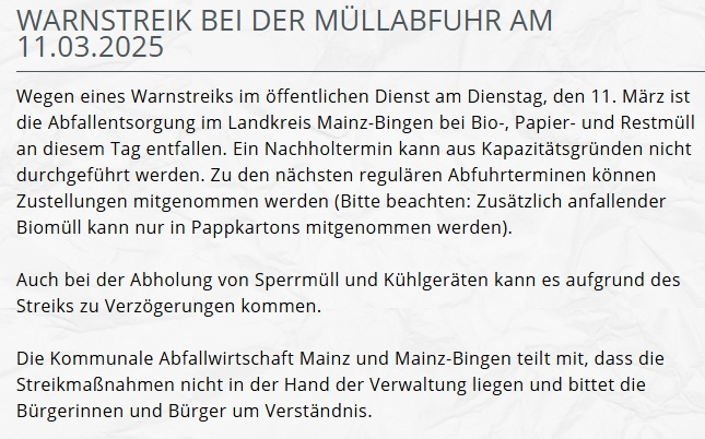 laut Informationen der KAW wurde wohl wegen eines Streiks der Papiermüll am 11.03.2025 nicht abgeholt.