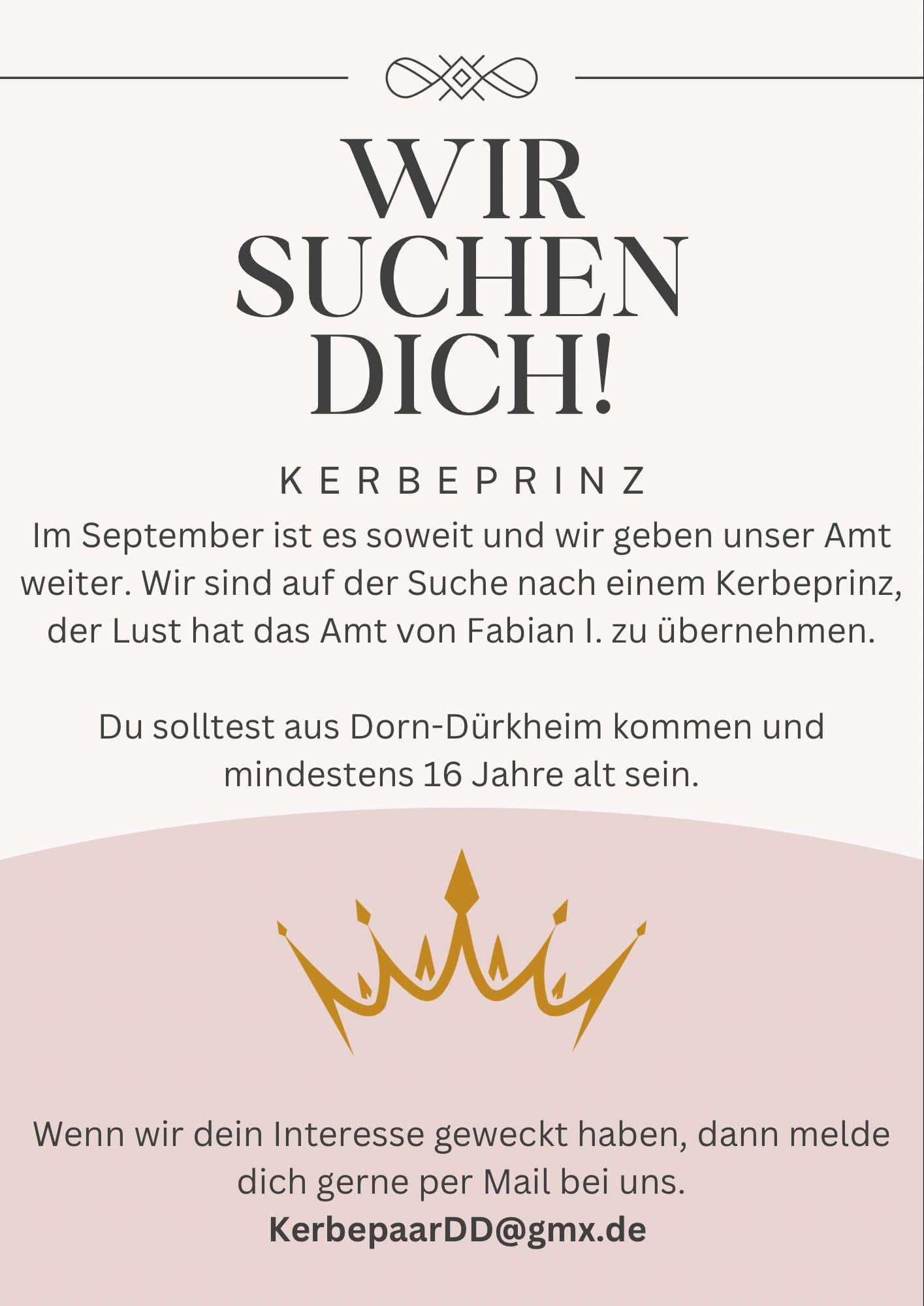 In Vorbereitung zur nächsten Kerb suchen wir einen Kerbeprinzen, der zusammen mit der Kerbeprinzessin die Gemeinde repräsentieren möchte. Wer Interesse hat bitte melden.
