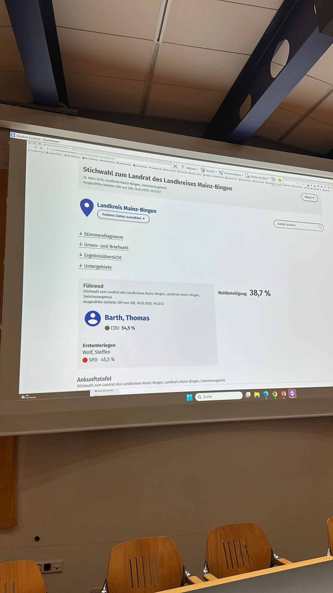 Wie schon im ersten Wahlgang kannst du das Ergebnis der Landratswahl digital einsehen. Den Link zur Webseite des Landkreises Mainz-Bingen findest du hier unter weiterführende Informationen.