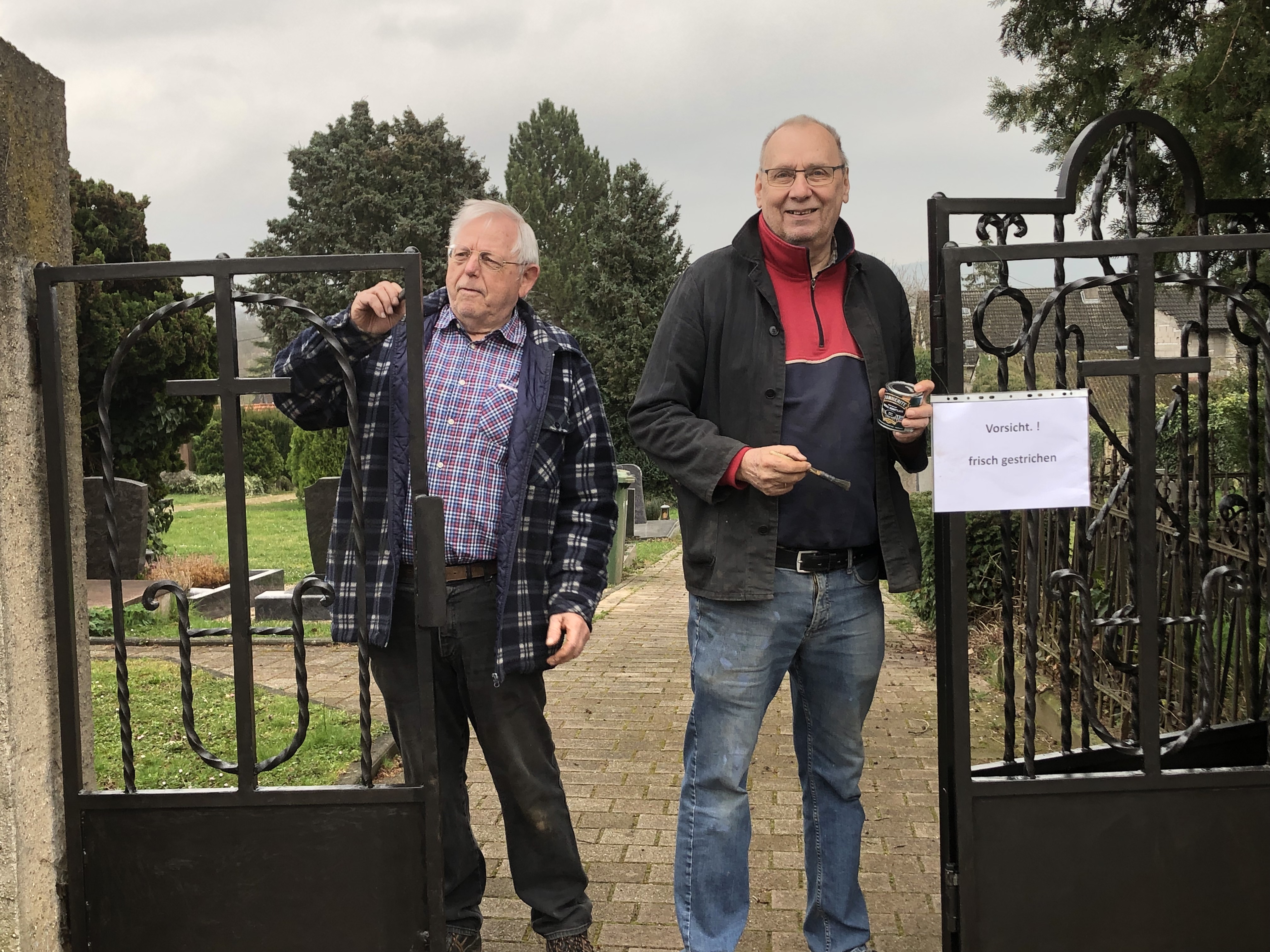 Hier übernahmen Manfred Frank (im Bild rechts) und Raimund Habig (links) das Projekt und brachten das Tor im Laufe von gut 4 Monaten akribisch und fachmännisch „auf Vordermann“. Sie schliffen es ab, grundierten und lackierten es, sodass das Tor nun wieder wie neu aussieht.
