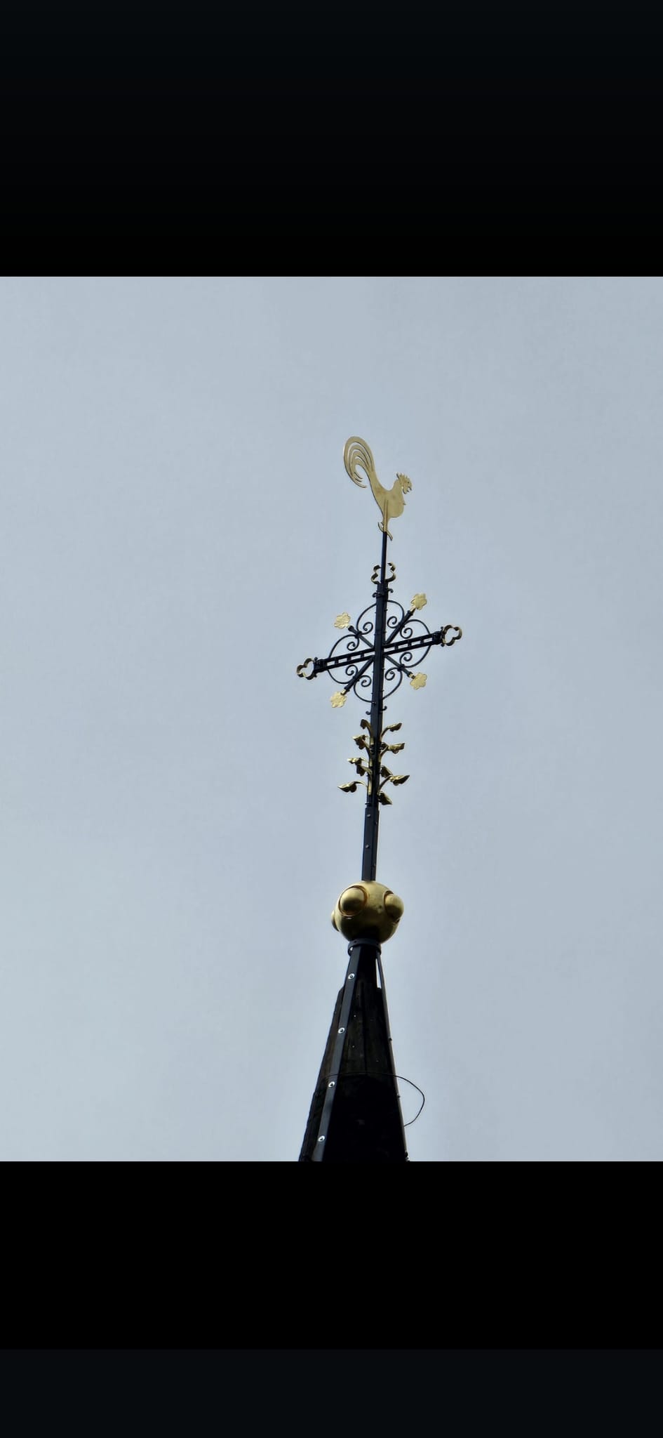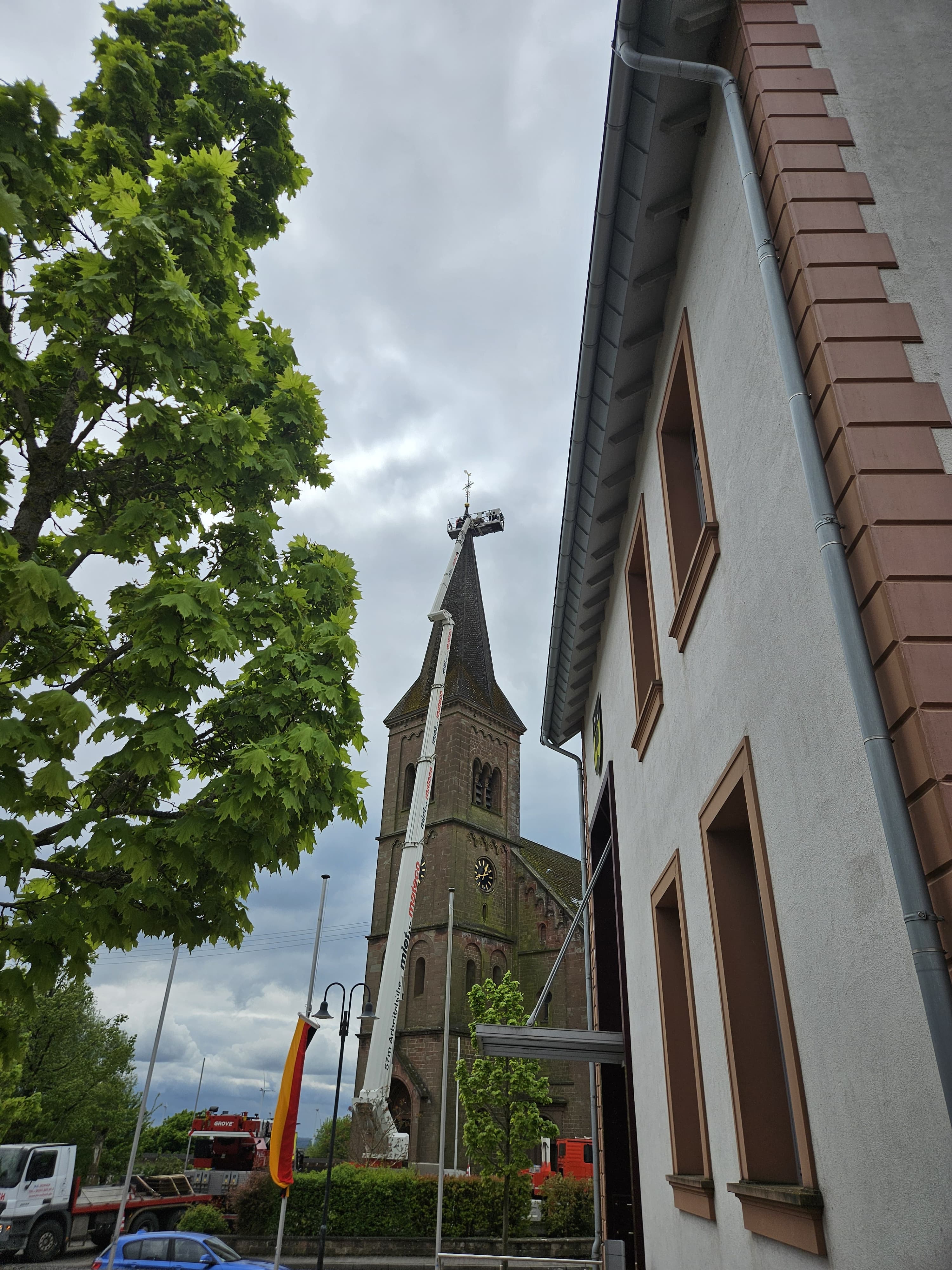 Bereits am 23.04. durch Pfarrer Heinke neu gesegnet, wurde das Turmkreuz am 24.04.2025 mittels schweren Gerätes, wieder auf der katholischen Kirche montiert.