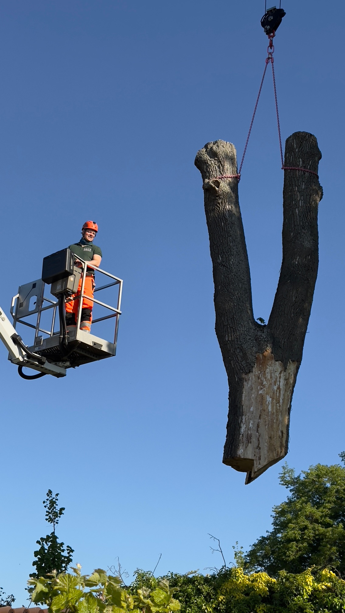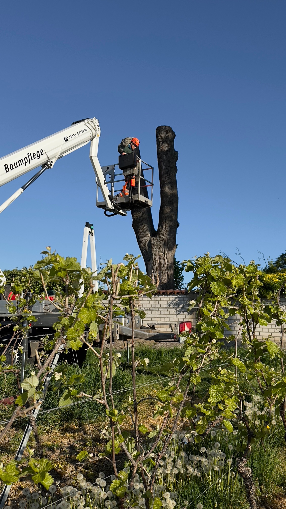 Heute wurde der Baumstumpf am Friedhof gefällt. Auch die Reste kommen jetzt nach und nach weg. Nachdem es lang genug trocken war, konnte der Kran bis an den Baum ranfahren. So konnte die Fällung endlich durchgeführt werden.