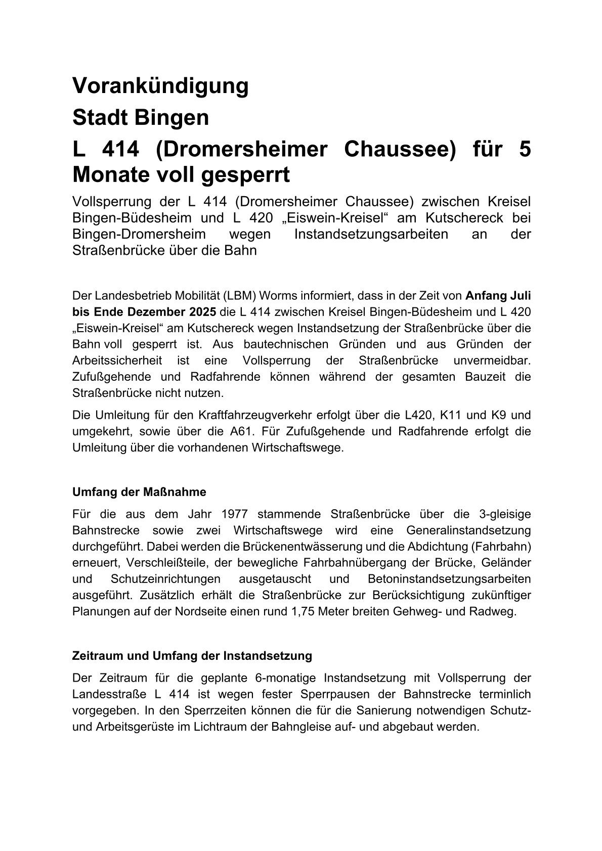 📢 Vorankündigung – Vollsperrung der L 414 in Bingen