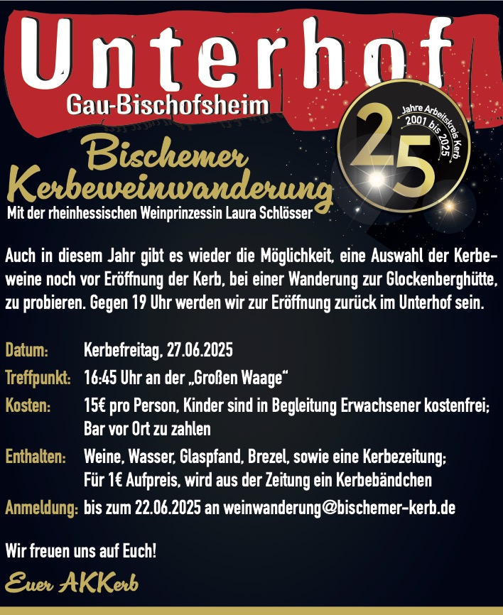 Anmeldung bitte bis zum 22.06.2025 über den u.a. Link bzw. per Mail an weinwanderung@bischemer-kerb.de