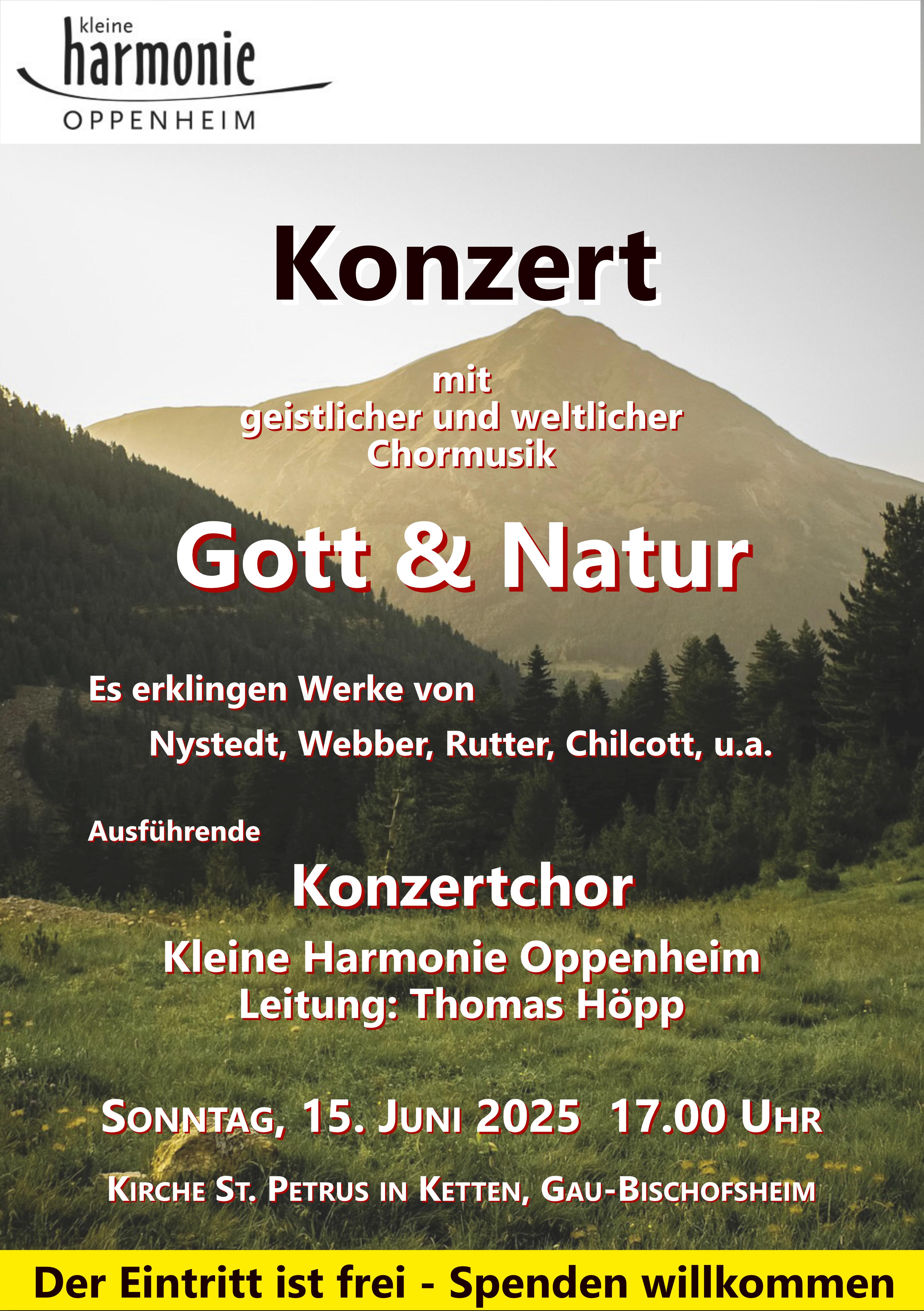 Am Dreifaltigkeitssonntag (15.06.2025) lädt der Konzertchor „Kleine Harmonie Oppenheim“ unter der Leitung von Thomas Höpp zu einem Chorkonzert mit geistlicher und weltlicher Musik in die Kirche Petrus in Ketten, Gau-Bischofsheim um 17.00 Uhr herzlich ein.