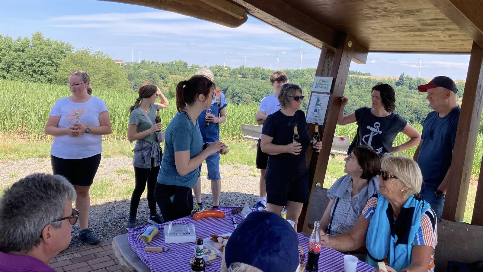 Rund 30 Mitglieder im Alter von 6 bis 66 Jahren nutzen den Sonntag für einen gemeinsamen Wandertag mit anschließendem Grillen. Ausgangspunkt ist die Moosalbhalle, von wo aus sich die Wandergruppe auf einen 7,5 Kilometer langen Rundweg begibt.