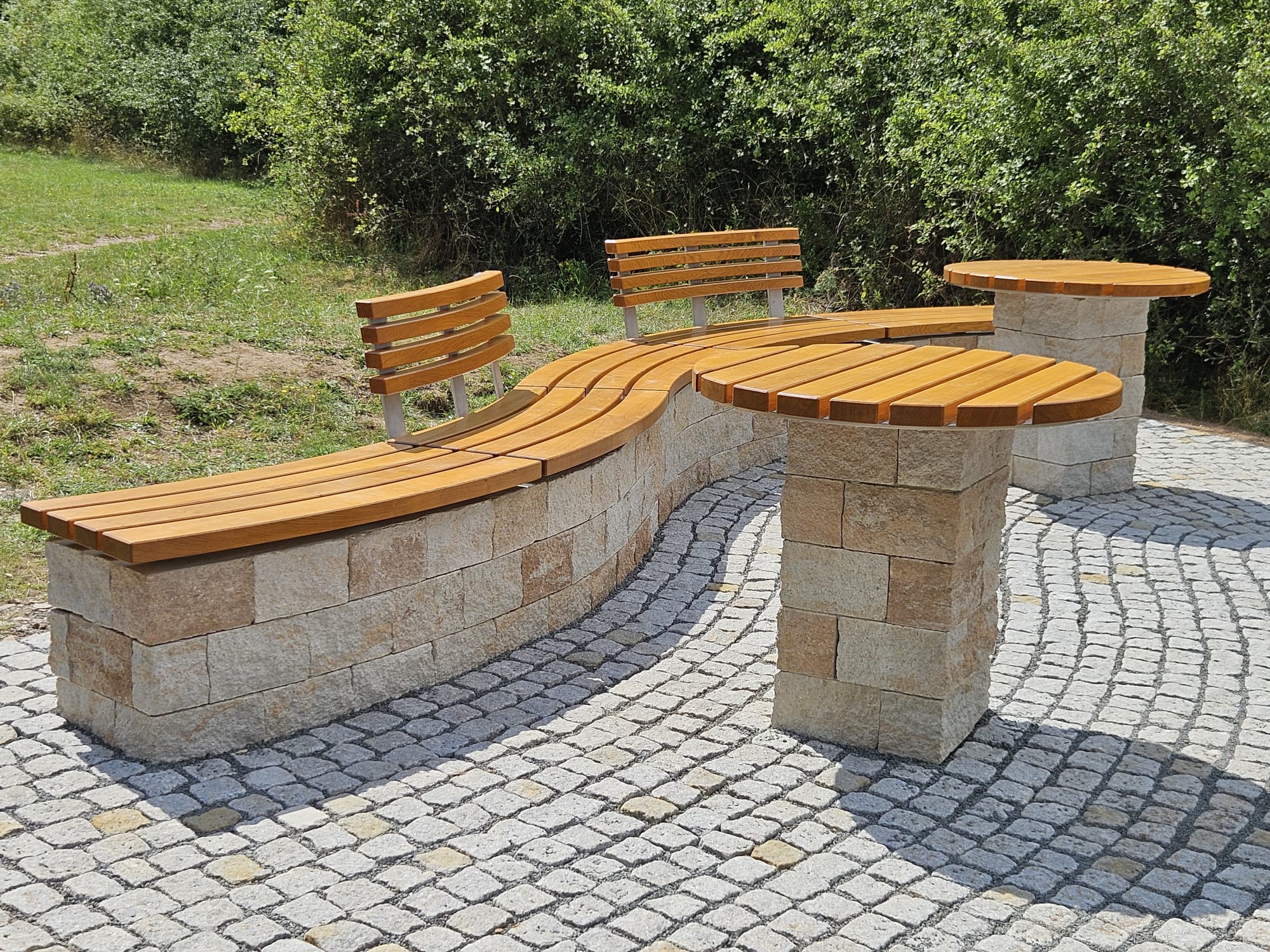 An einem der schönsten Aussichtspunkte auf unser Dorf, gleich neben dem Kloster und dem dazugehörigen Bolzplatz, entstand über etliche schweißtreibende Donnerstage hinweg eine Bank nebst zwei kleinen Tischchen.