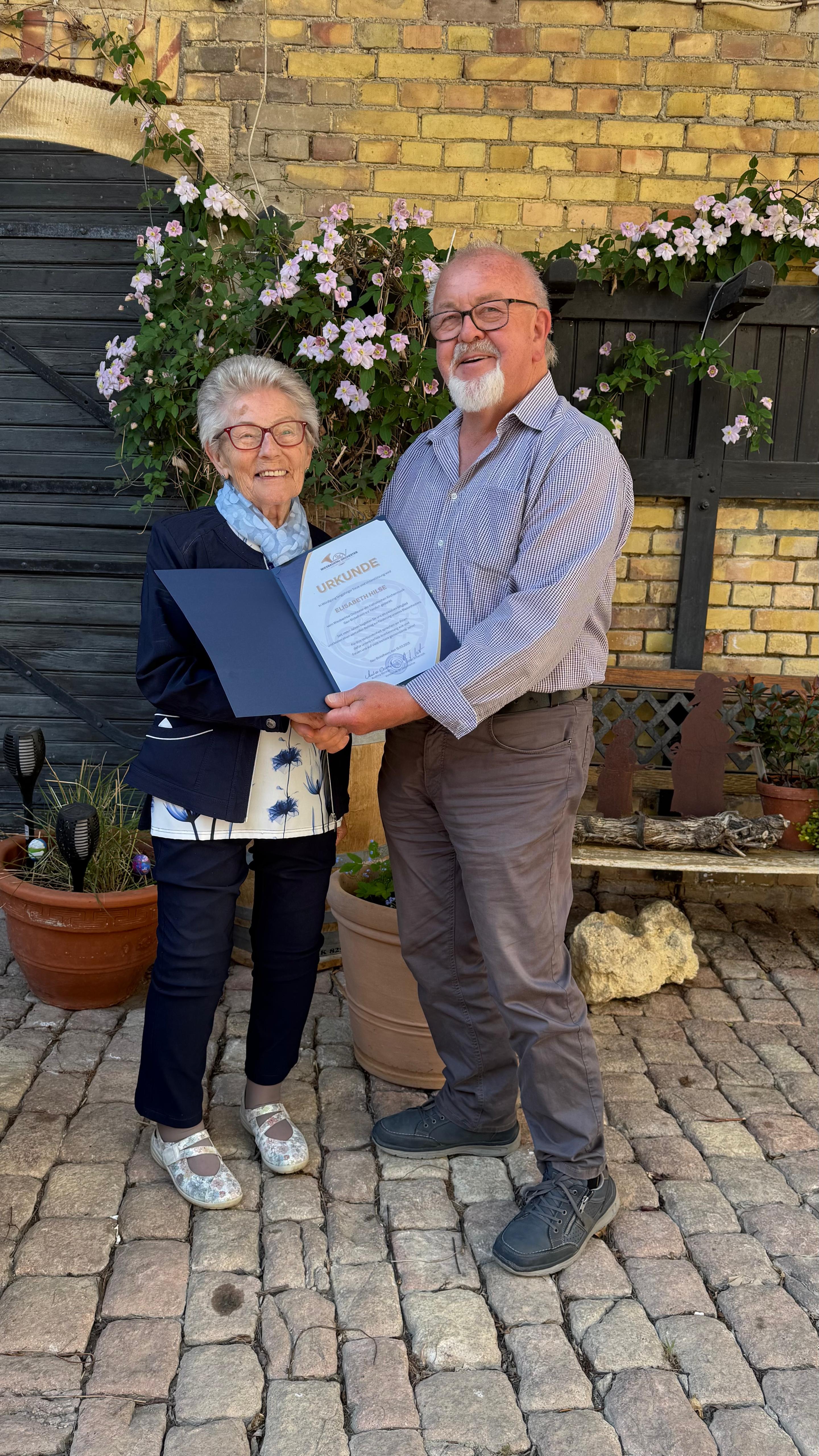 Im Rahmen unseres 100-jährigen Jubiläums besuchte der Vorsitzende Oskar Erbenich Frau Elisabeth Hilse und überreichte ihr eine Urkunde in Anerkennung ihrer langjährigen passiven Mitgliedschaft. Wir freuen uns sehr über ihre Verbundenheit und hoffen, dass sie uns noch lange unterstützend zur Seite steht.