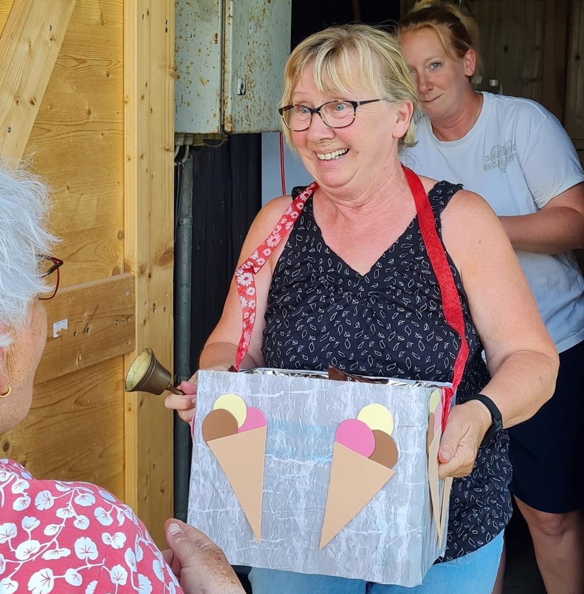 … das ist weitaus mehr als nur ein kühler Genuss. Es aktiviert unsere Sinne und bringt uns ein Stück Kindheitserinnerung zurück. So wurde es von Beate Petry nach der Grillpause verkündet und sofort in die Tat umgesetzt. Sehr zur Freude aller Gäste des Seniorennachmittags hatte sie in einem selbstgebastelten Eis-Bauchladen für jeden ein leckeres Eis dabei.