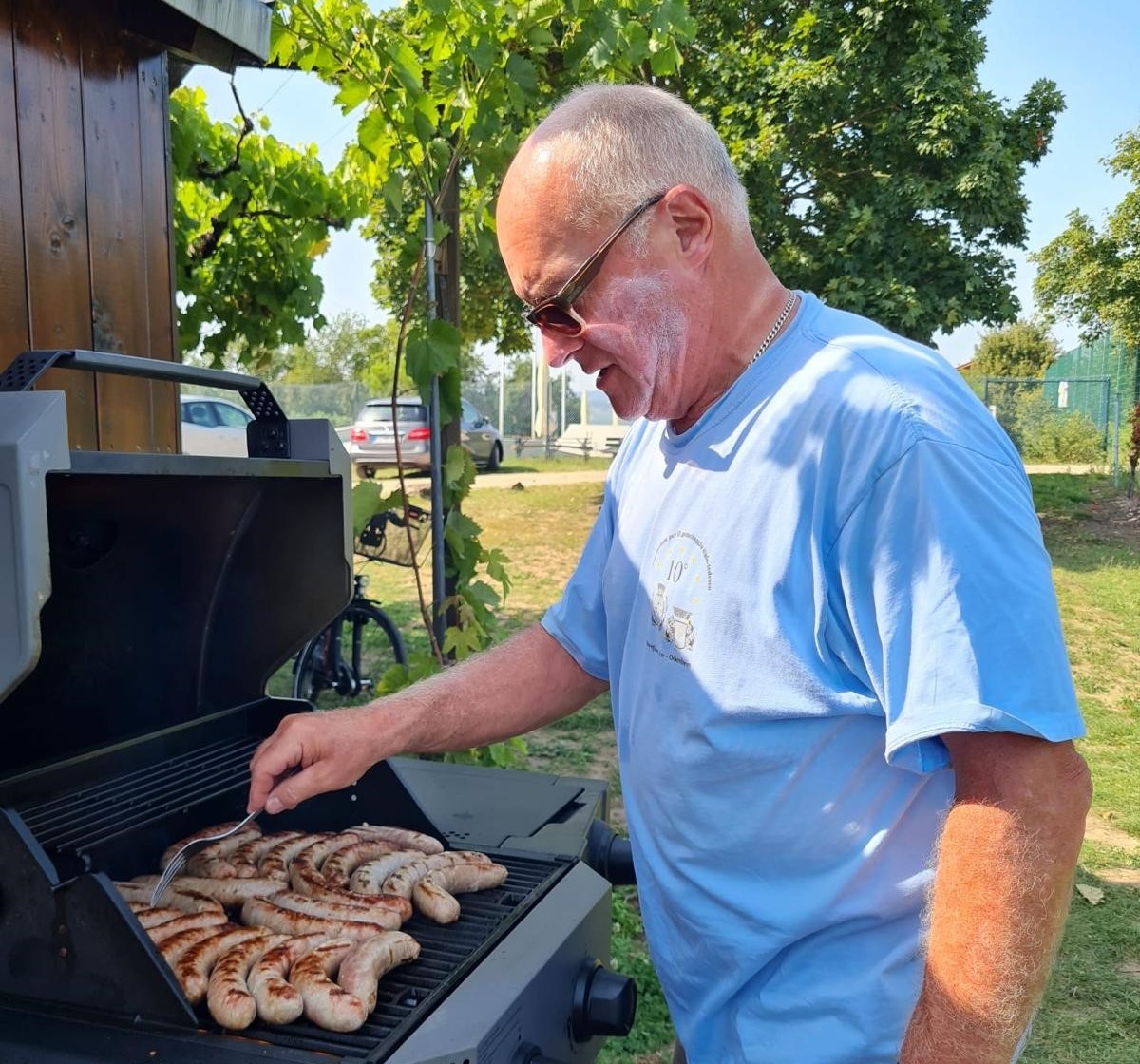 Aber jetzt von Anfang an: Das Seniorenteam hatte am 13.08. 2025 in die Grillhütte eingeladen und begrüßte alle Besucher mit schönen Texten und Liedern von Sommer, Sonne, Regen und Grillen. Der hauseigene Troubadour Heinz-Peter Germeroth war ständig im Einsatz und trällerte Lieder von Rudi Carrell, Rex Gildo und Adamo. Das Zwiegespräch über Krankheiten war ein echter Kracher, erfuhr man doch da, dass man für bestimmte Krankheiten nach Ägypten zum „Ar(s)chäologen“ fliegen muss. Der Song „Ein kleines Glück“ war den Geburtstagskindern vom Monat Juli gewidmet, es folgten weitere Zwiegespräche und ein Loblied von Marita Krone auf die Grillsaison. Hermann-Josef Gerharz stellte musikalisch die Frage: “Warum ist es bei uns so schön (Liedtext: Warum ist es am Rhein so schön?)“ und dankte mit einem selbstverfassten Text dem Team für die schönen Nachmittage. Mit dem Gebet „Grill Unser“ ging es in die Pause. Zur Bratwurst, die gekonnt von Michael Müller gegrillt wurde, gab es außer dem Weck auch ein kühles Bier – je nach Geschmack mit oder ohne Alkohol. Vom Überraschungs-Eis danach wurde ja schon berichtet.