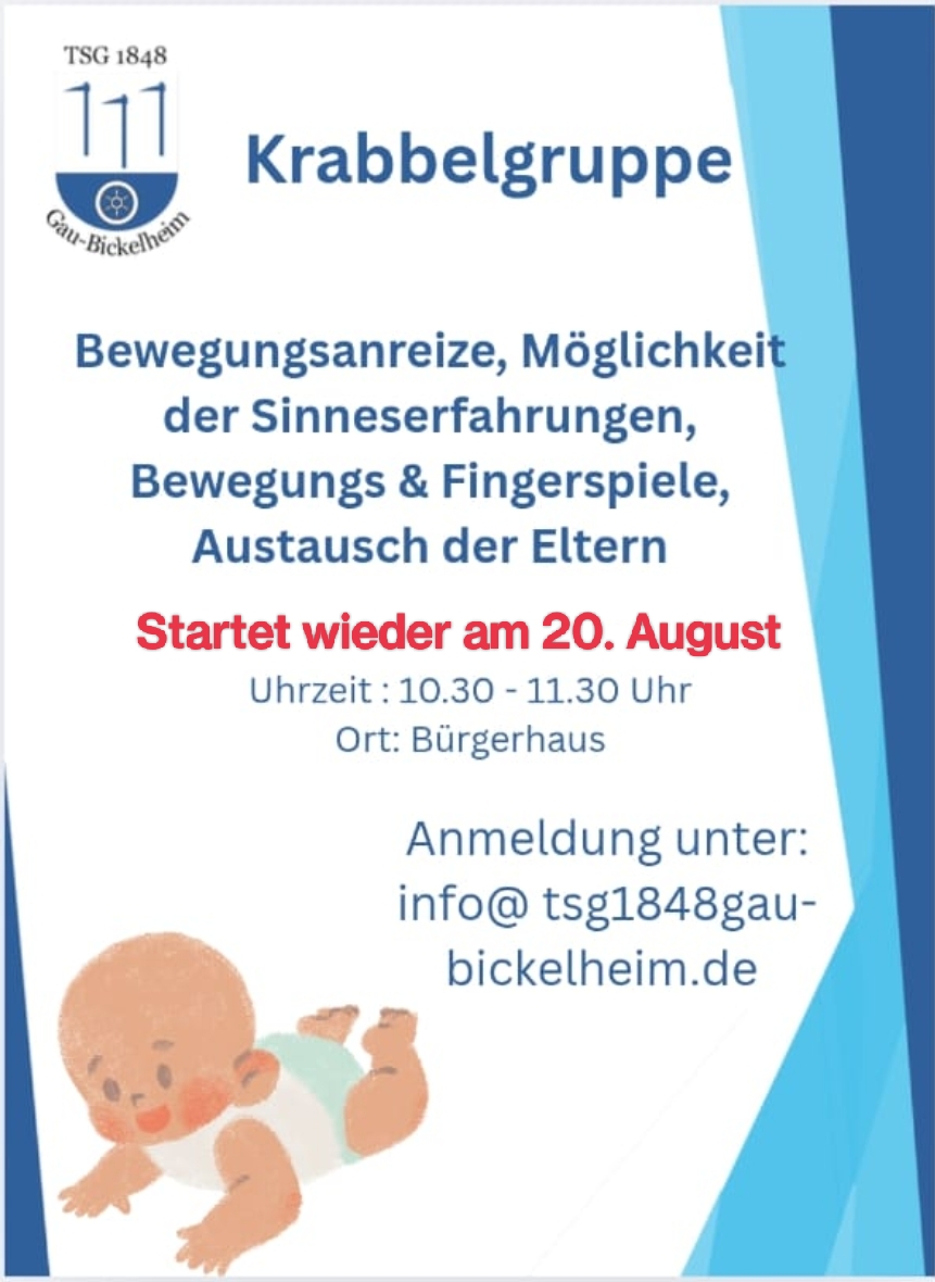 Die Krabbelgruppe startet wieder am 20.08. um 10:30 Uhr im Bürgerhaus.