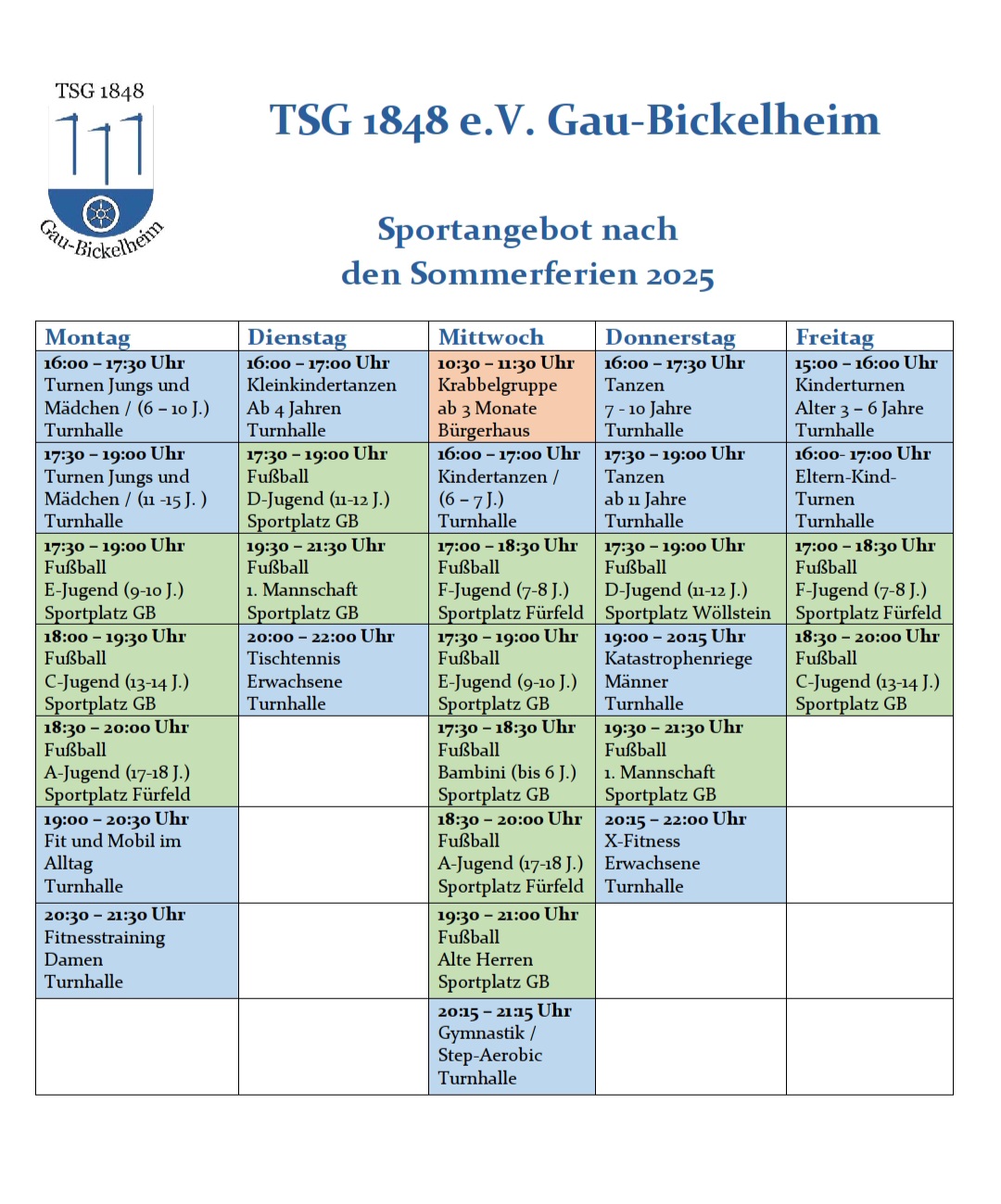 Das aktuelle TSG Sportangebot in der Turnhalle und auf dem Sportplatz.