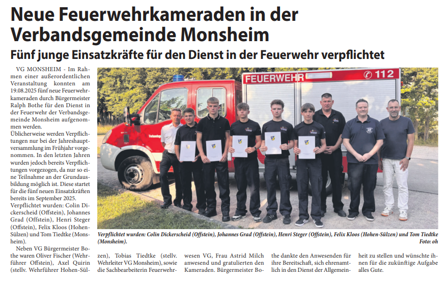 Normalerweise werden Verpflichtungen bei der jährlichen Jahreshauptversammlung der Feuerwehren der VG Monsheim durch den VG Bürgermeister vorgenommen. Seid einigen Jahren haben wir die Möglichkeit, die Verpflichtungen vorzuziehen, um den neuen Kameraden eine Möglichkeit zu bieten, damit sie ihren Grundlehrgang (dieser startet im September) absolvieren können.