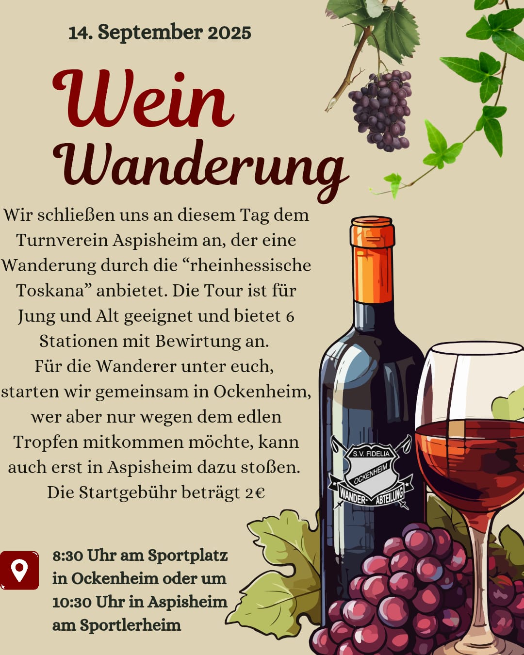 Treffpunkt: 8:30 Uhr am Sportlerheim in Ockenheim oder um 10:30 Uhr in Aspisheim am Sportplatz.