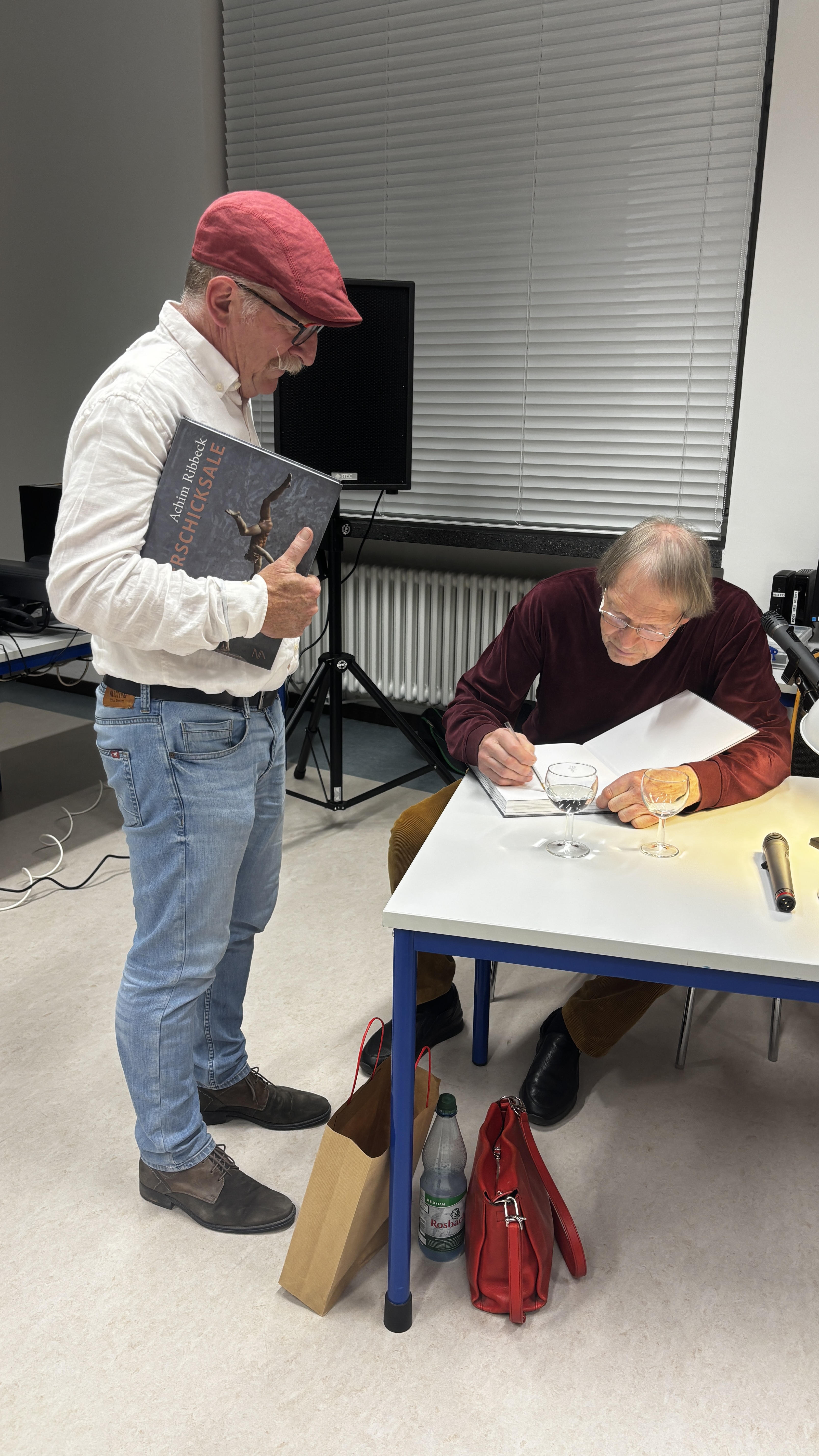 Gestern fand in der Mainzer Stadtbibliothek eine Lesung zur Buchveröffentlichung unseres Künstlers Achim Ribbeck statt. Im gut gefüllten Saal las das Ehepaar Mandel/Ribbeck einige Passagen ihres Buches vor. Anschließend konnte das neu veröffentlichte Buch erworben werden und wurde, wer das wünschte, vom Künstler signiert. Die Gutscheininhaber für das Buch können sich jetzt beim Verlag melden, dann wird das Buch zugeschickt. Viel Spaß beim Lesen. Einige Bilder des Abends, sowie ein Link zur Reportage vom Südwestfunk sind beigefügt.