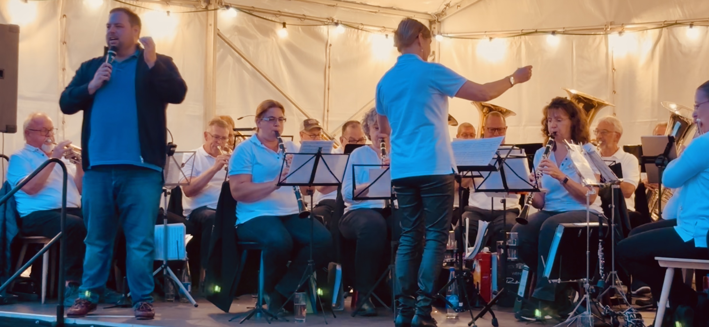 Uns Musikerinnen und Musikern hat das Spielen riesigen Spaß gemacht und die gute Laune sprang aufs Publikum über. Ein echter Höhepunkt war der Auftritt des künftigen VG-Bürgermeisters Johannes Brüchert: Zu unserer Musik legte er mit „Auf der Vogelwiese“ eine tolle Gesangseinlage hin und begeisterte die Besucher.