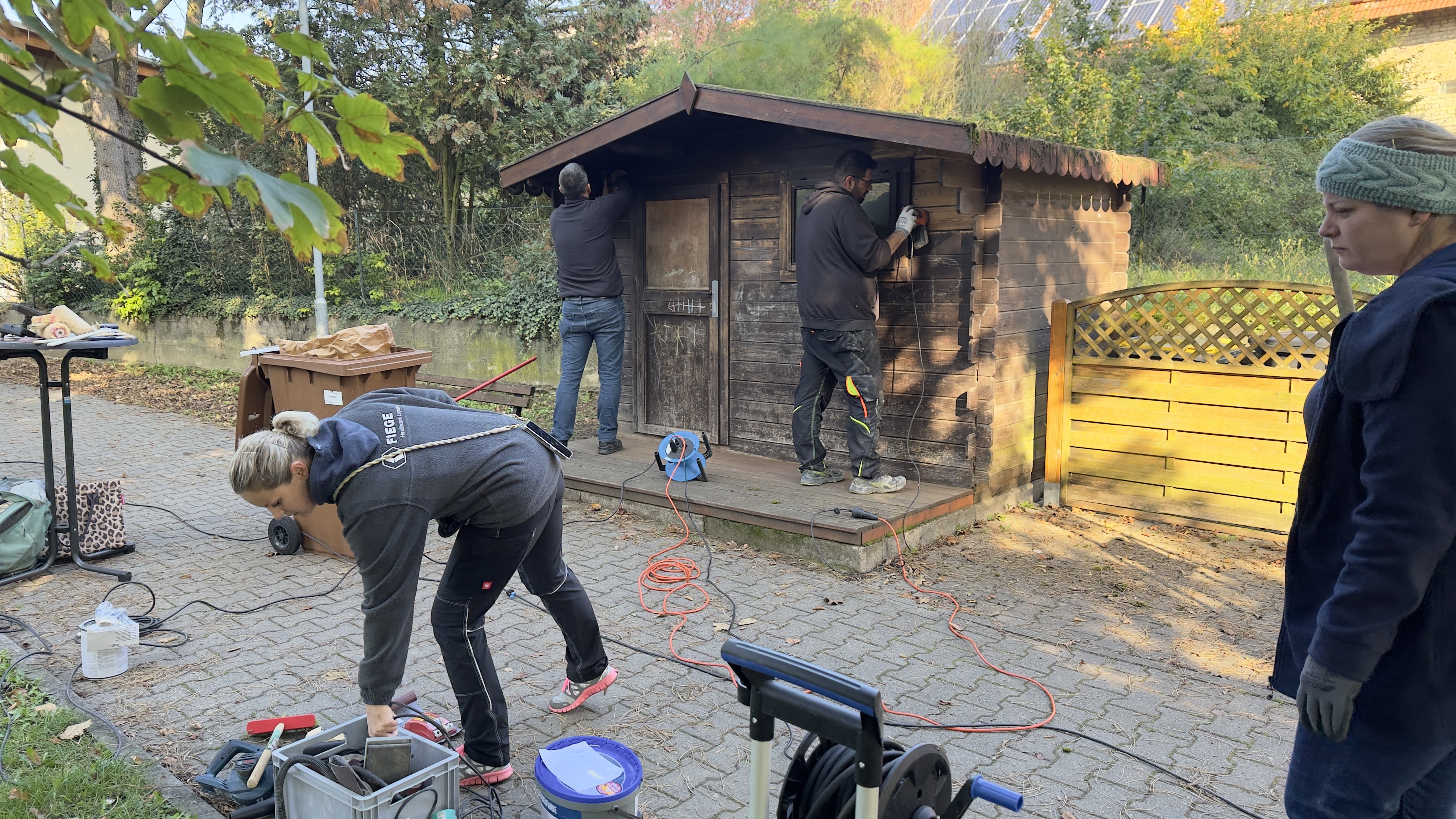 Heute hat ein Teil der Eltern der Kindergartenkinder die beiden Lagerhäuschen am Eingang unserer Kindertagesstätte neu angestrichen. Das Holzhaus wurde erst abgeschliffen, dabei stellten wir fest, dass es schade wäre das Holz mit dunkler Farbe zu streichen. Kurzerhand wurde farblose Lasur gekauft um die Holzstruktur sichtbar zu lassen. Zudem war es jetzt deutlich heller. Gleiches gilt für das Massivhäuschen, das mit einer Cremefarbe gestrichen wurde, als Vorbereitung für den nächsten Schritt. Dazu aber erst mehr, wenn er umgesetzt ist. Vielen Dank für die Einsatzbereitschaft und der Hilfe beim Geldsparen. Habe ihr toll gemacht.