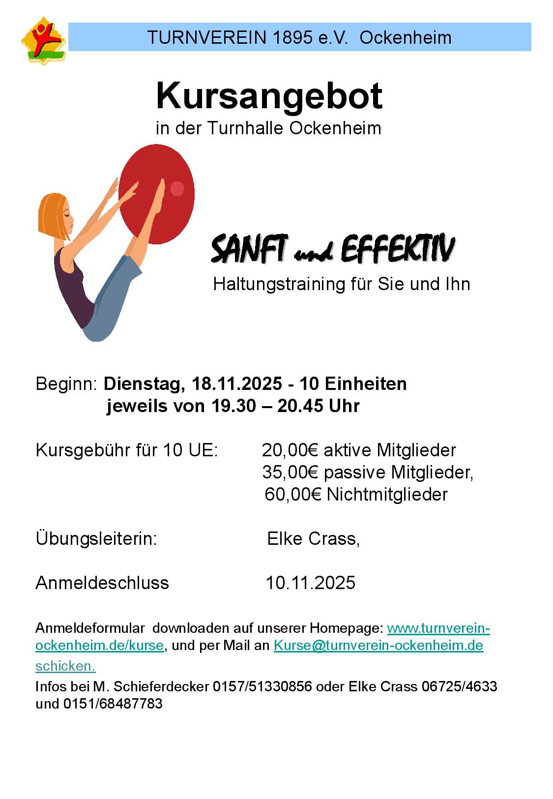 Ab dem 18. November startet eine neue Runde „Sanft und Effektiv“ – das Haltungstraining für alle, die ihrem Rücken etwas Gutes tun wollen. In zehn Einheiten zeigt dir Elke Crass, wie du mit gezielten, sanften Übungen deine Haltung verbesserst und dich im Alltag stärker und beweglicher fühlst.