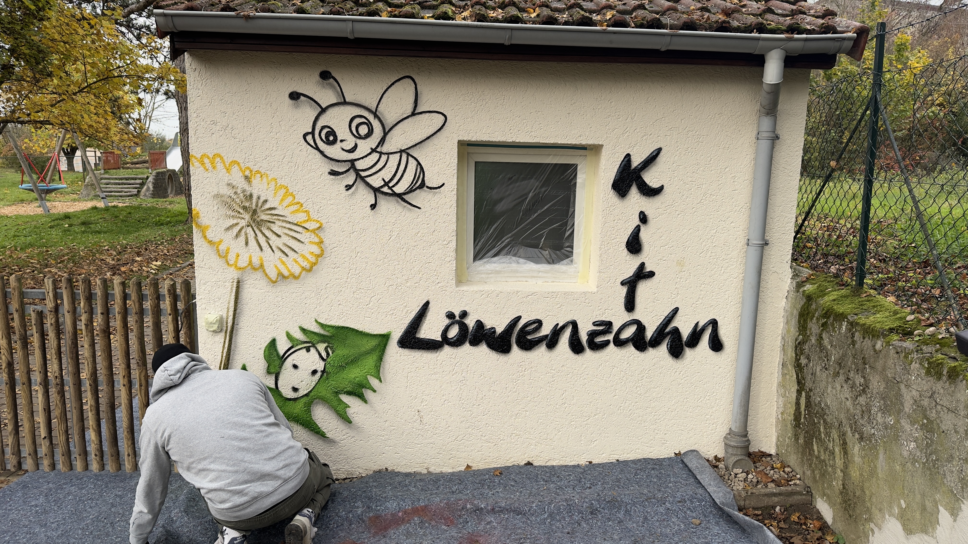 Heute wurde an unserer Kita im Eingangsbereich das neue Logo angebracht. Nachdem ein paar Eltern vor 4 Wochen die Grundarbeiten gemacht hatten, war heute der Künstler da um das abzuschließen. Wer sein KInd heute geholt hat konnte das Bild schon bewundern. Alle anderen haben die Gelegenheit bei einem Spaziergang einmal am Kindergarten vorbei zu gehen und sich das Bild anzuschauen.
