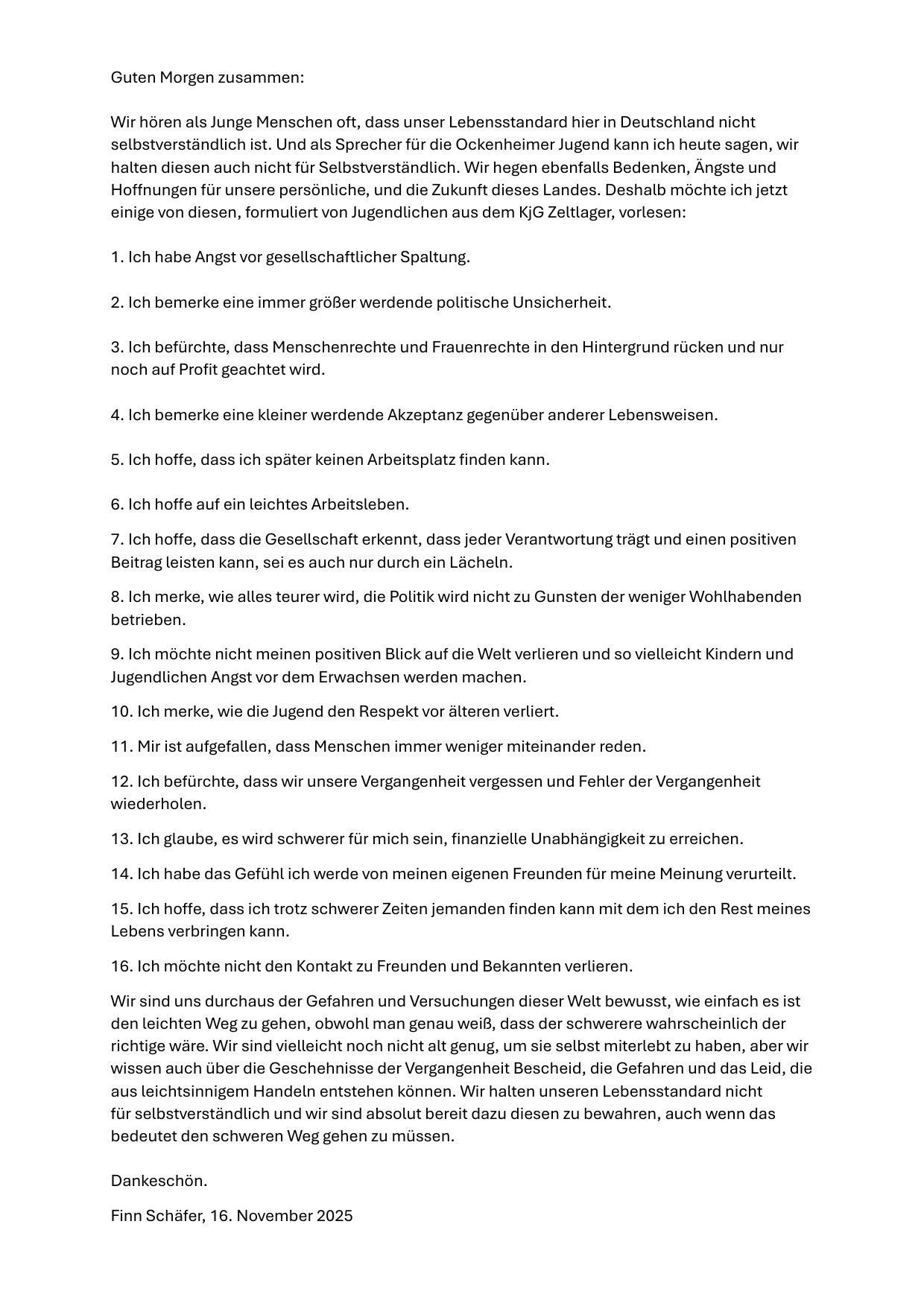 So kann der Volkstrauertag nicht nur ein Tag des Erinnerns sein, sondern vor allem ein Anstoß – ein Anstoß, wachsam und mutig zu bleiben.
