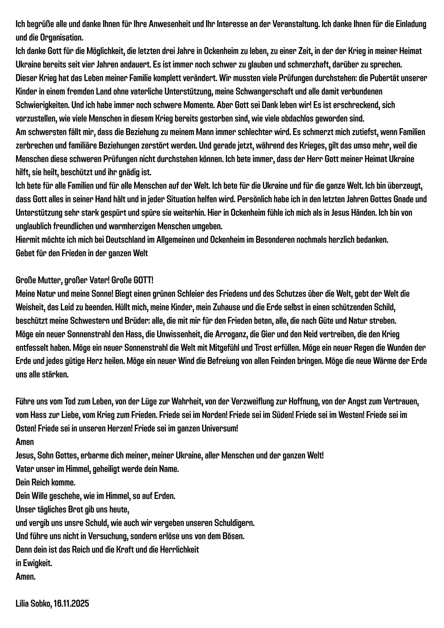 Neben der Ansprache der Ortsbürgermeisterin beeindruckten Beiträge der Jungen Generation und einer Frau, die vor drei Jahren mit ihrer Familie Schutz in Ockenheim fand. Ihr Blick auf das Schicksal ihrer Heimat nach Jahren des Krieges ging allen zu Herzen. 💔