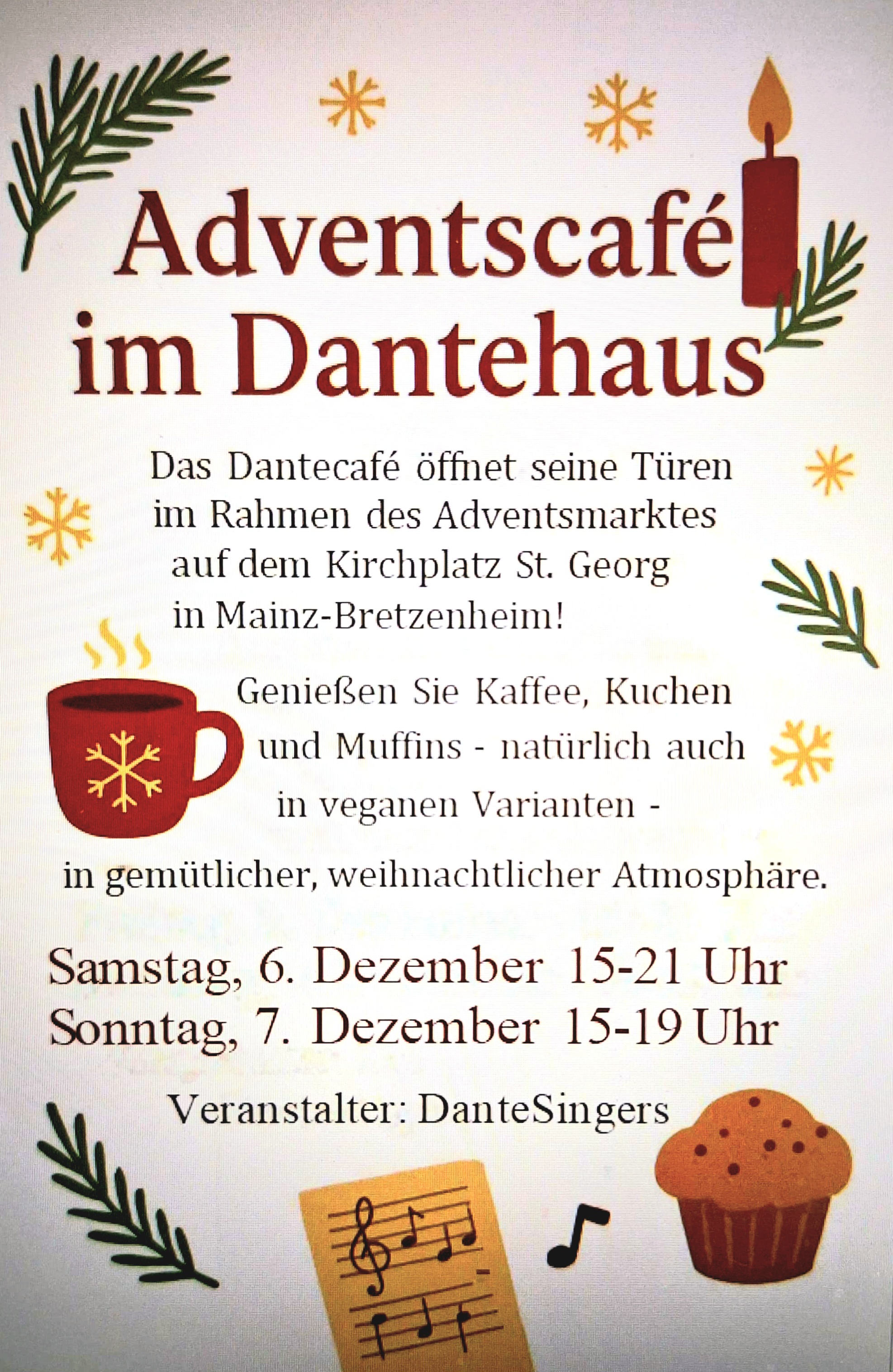 Wir laden herzlich ein zum Adventscafé im Dantehaus im Rahmen des Adventsmarktes auf dem Kirchplatz St. Georg in Mainz-Bretzenheim.