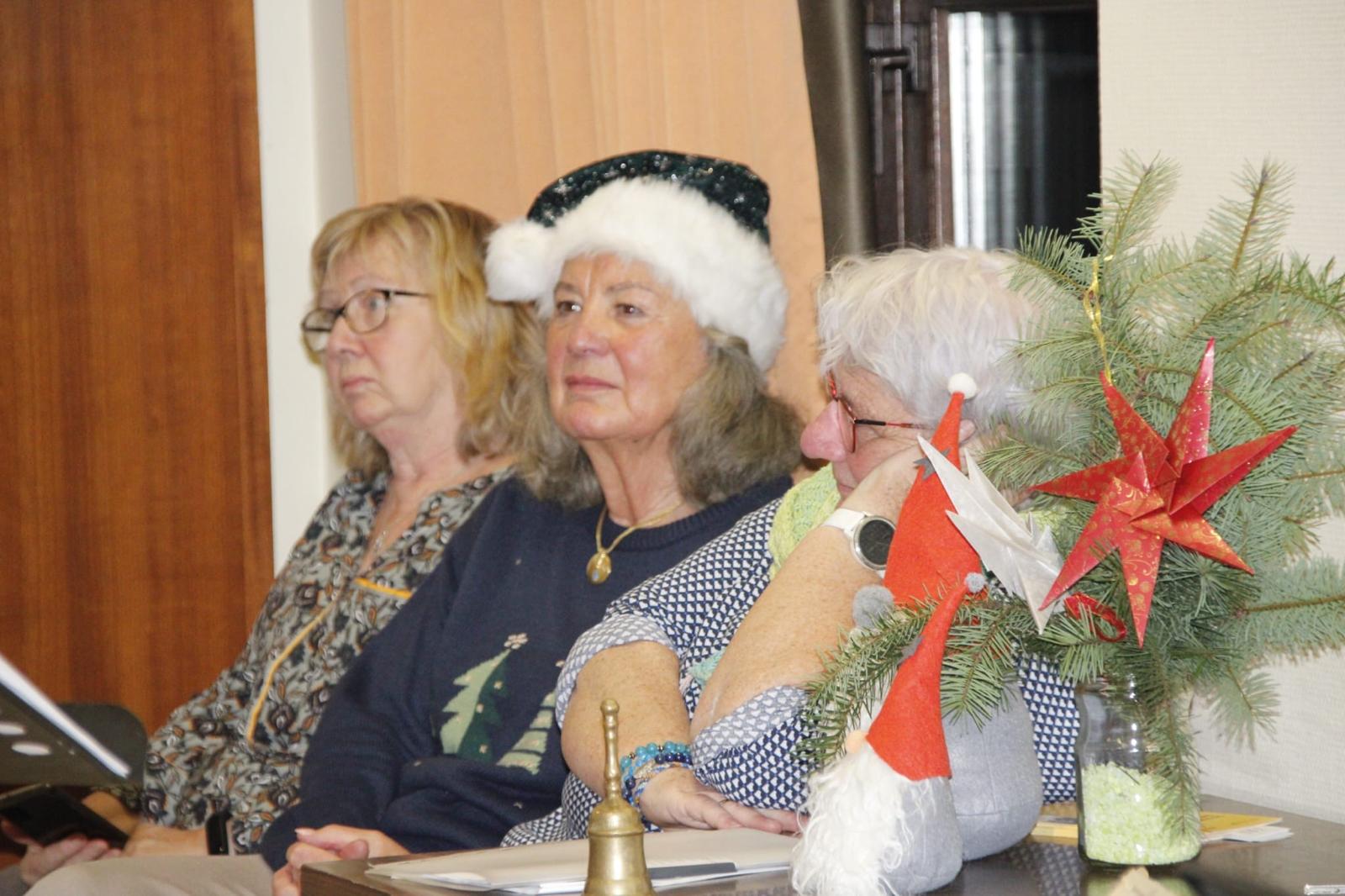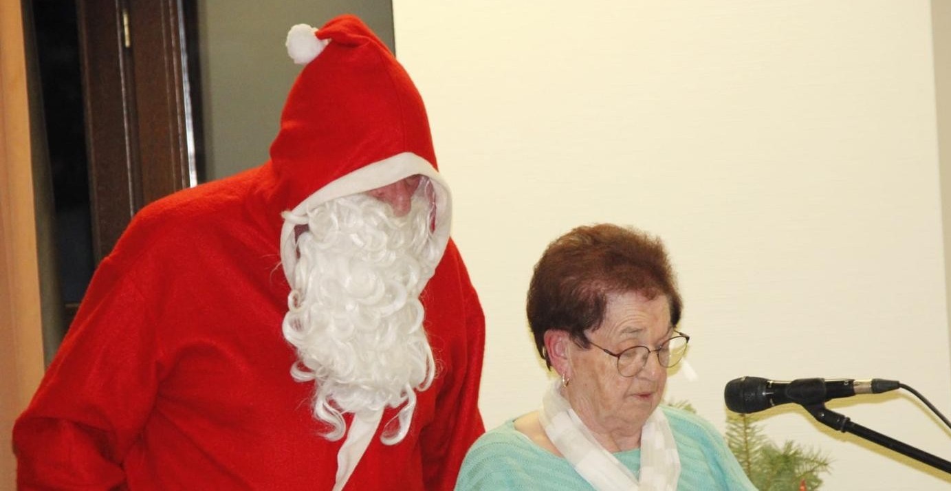 Danach ging es mit Weihnachtsgedichten und -liedern weiter und unsere Seniorinnen Betty Schäfer und Marita Krone punkteten mit auswendig aufgesagten bzw. selbst geschriebenen Weihnachtsgedichten. Und dann war er da, der Nikolaus. Ihm zur Seite stand Engel Elke Kaiser, die beim Überreichen der Geschenke fleißig half. Aber der Nikolaus hatte auch ein Geschenk der Senioren an das Team dabei, das in diesem Jahr besonders üppig ausgefallen war. Dazu hatte Marita Krone ein Gedicht verfasst, das von Herzlichkeit, guten Ideen und dem gemeinsamen Lachen schwärmte. Bevor nach weiteren Weihnachtstexten und stimmungsvollen Liedern der Nachmittag endete, wurden noch einmal allen Spendern gedankt, die den Seniorennachmittag übers Jahr so großzügig unterstützt haben.