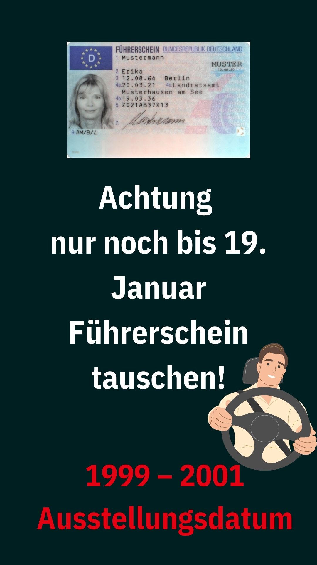 Wer einen Führerschein mit Ausstellungsdatum 1999–2001 besitzt, muss diesen bis spätestens 19. Januar 2026 umtauschen.