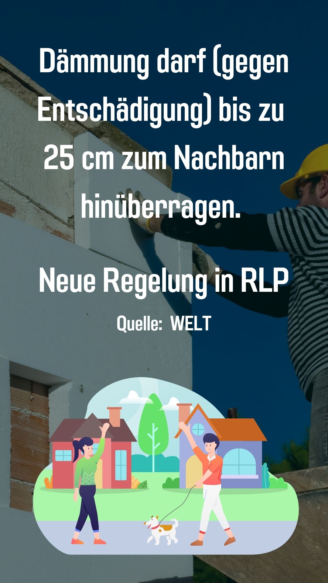 In Rheinland-Pfalz gilt eine neue Regelung: Gebäudedämmung darf – gegen Entschädigung – bis zu 25 cm auf das Nachbargrundstück überstehen. Das soll energetische Sanierungen erleichtern und Klarheit schaffen. Quelle: https://www.welt.de/regionales/rheinland-pfalz-saarland/article69533abaf6fc544dba9b70d2/waermedaemmung-und-balkone-neues-recht-in-kraft.html, Abruf 31.12.2025 15:54 Uhr