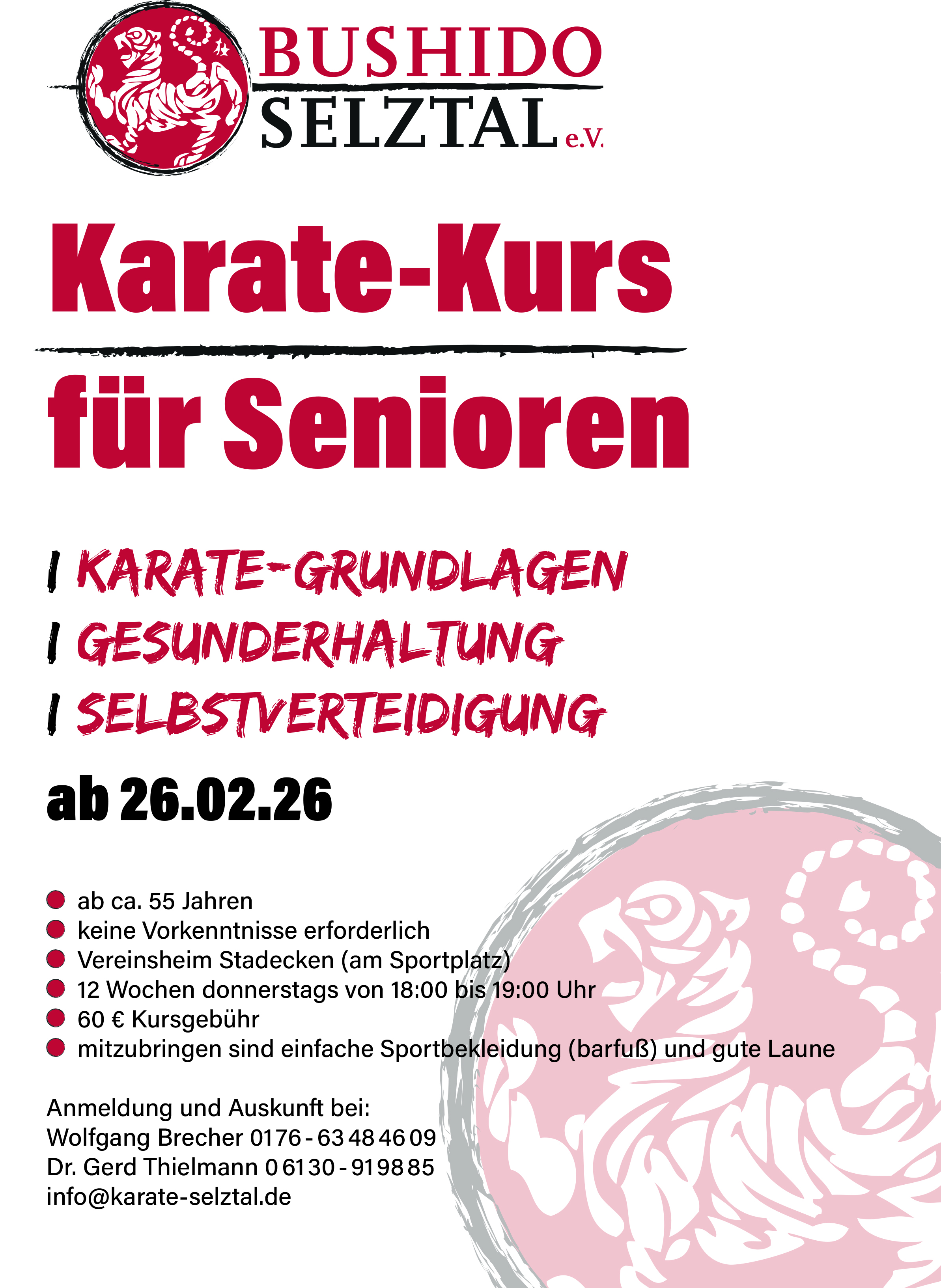 Start am 26.2.26 um 18.00 Uhr - Ein neuer Karate-Kurs für die Best-Ager ab ca. 55 Jahre. 12 Wochen 1 x wöchentlich. Fitness, Gesunderhaltung und Selbstverteidigung - Mann und/oder Frau - kommt vorbei und macht mit.