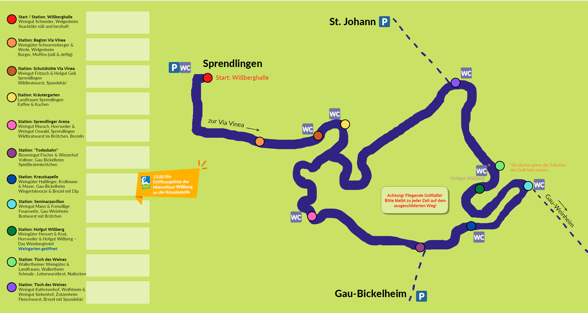 Entlang der Via Vinea & rund um den Wißberg bieten die HiwwelConnection, die Landfrauen Sprendlingen sowie Weingüter aus Gau-Bickelheim, Gau Weinheim & Wallertheim gemeinsam mit weiteren Vereinen von 11 bis 18 Uhr Wein, Traubensaft und kleine Snacks sowie Kaffee und Kuchen zur Stärkung an.