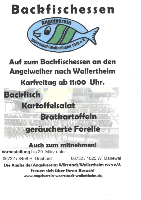 Noch schnell für Karfreitag vorbestellen: Backfisch im Bierteig . Entweder zum Essen vor Ort oder zum Mitnehmen für zuhause. Eine gute Gelegenheit einmal das Kochen ausfallen zu lassen. Da die Angler etwas vorplanen müssen, bitte unbedingt vorbestellen. Und gerne an Nachbarn und Freunde weitersagen